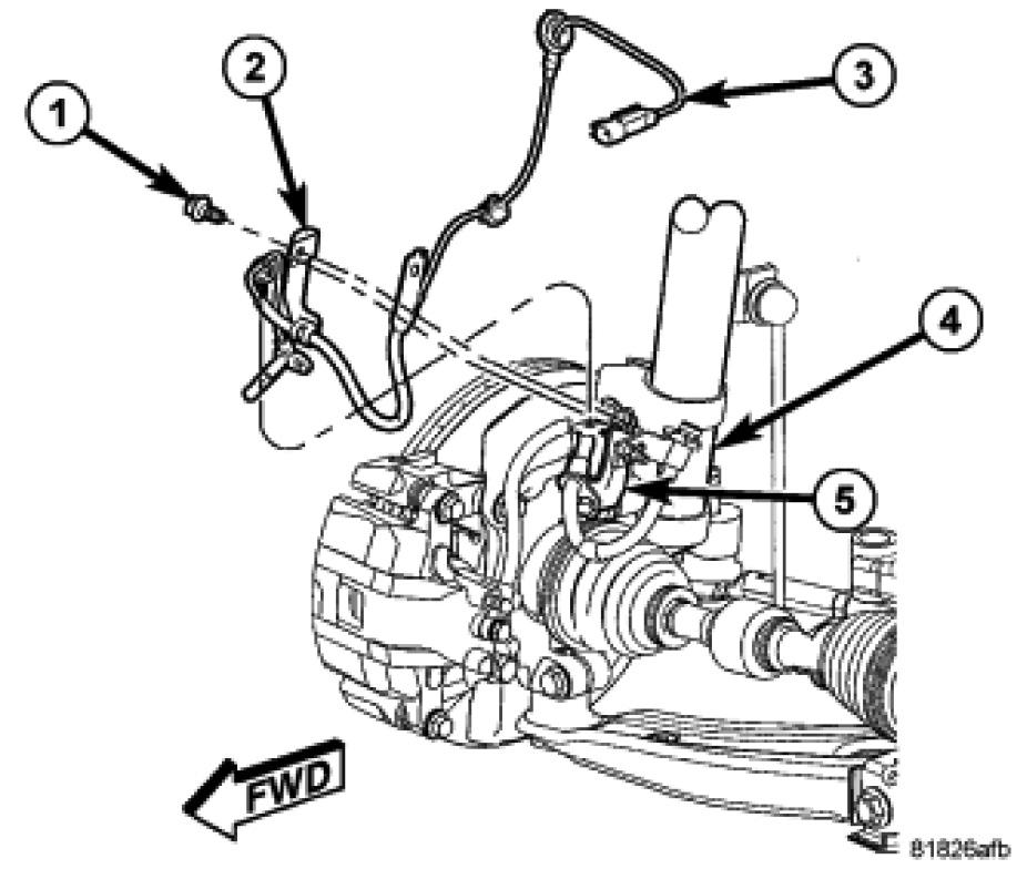 3. Position the wheel speed sensor routing bracket (2) on the brake flex hose bracket (5) and install the mounting screw (1). Tighten the mounting screw to 18 Nm (13 ft. lbs.).