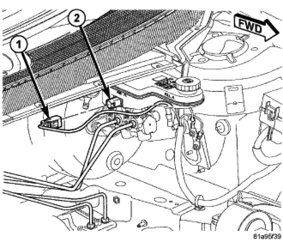1. Align the brake fluid level switch with its mounting hole on the right side of the master cylinder brake fluid reservoir. Push the switch into the fluid reservoir until the switch retaining tabs (1) are expanded on the opposite side of the reservoir (2), locking it in place.