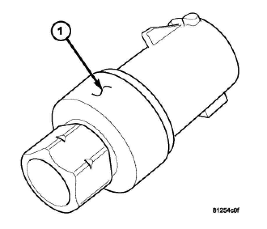 The A/C pressure transducer (1) is a switch that is installed on a fitting located on the A/C discharge line. An internally threaded fitting on the A/C pressure transducer connects it to the externally threaded Schrader-type fitting on the A/C discharge line. A rubber O-ring seals the connection between the A/C pressure transducer and the discharge line fitting. The A/C pressure transducer is connected to the vehicle electrical system by a molded plastic connector with three terminals.