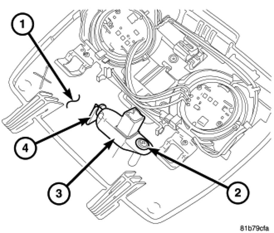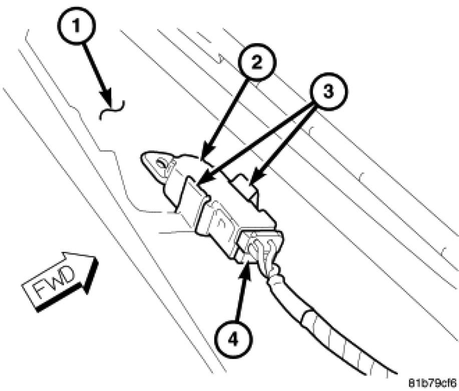 1. Position the infrared sensor (3) onto the back of the overhead console (1). Align the slot on the front of the sensor with the tabs (4) on the console.
