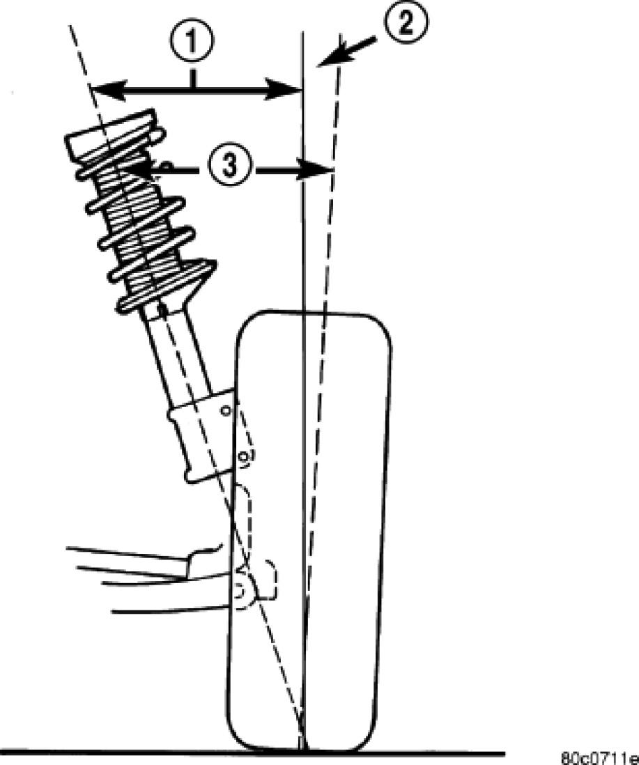 Steering axis inclination (1) is the angle between a true vertical line starting at the center of the tire at the road contact point and a line drawn through the center of the upper ball joint (or strut) and the lower ball joint. S.A.I. is built into the vehicle and is not an adjustable angle. If S.A.I. is not within specifications, a bent or damaged suspension component may be the cause.