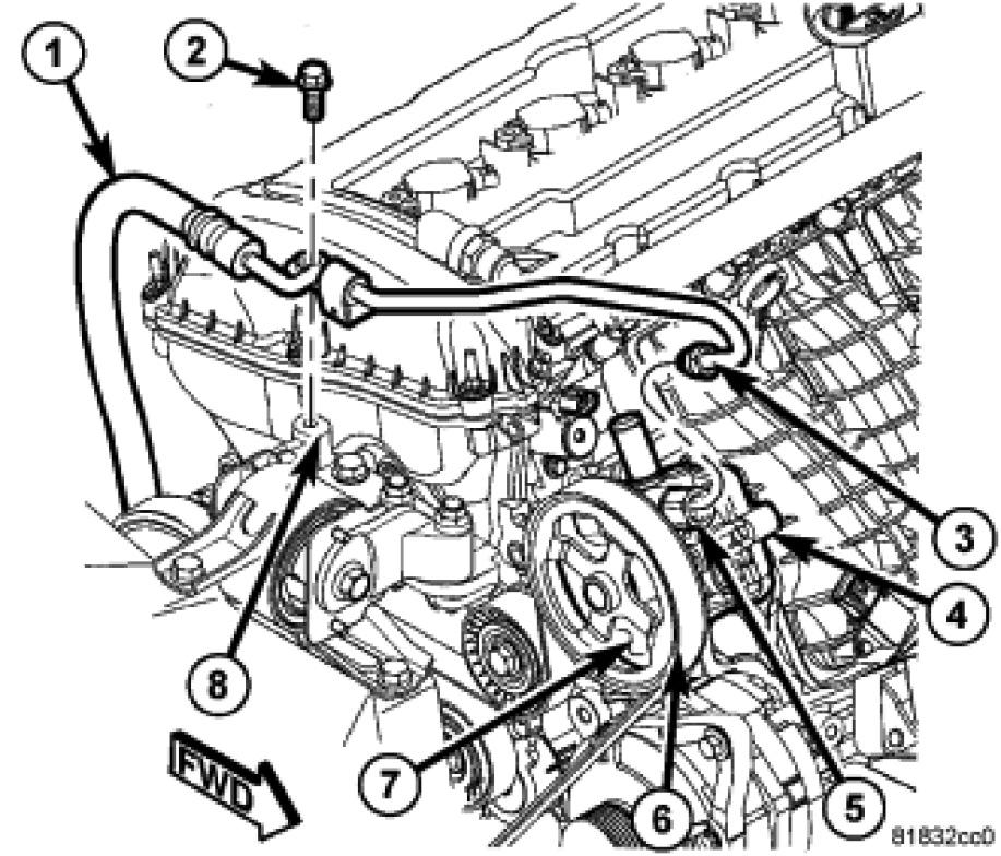 7. Install the pressure hose routing bracket bolt (2) to the upper mount (8).