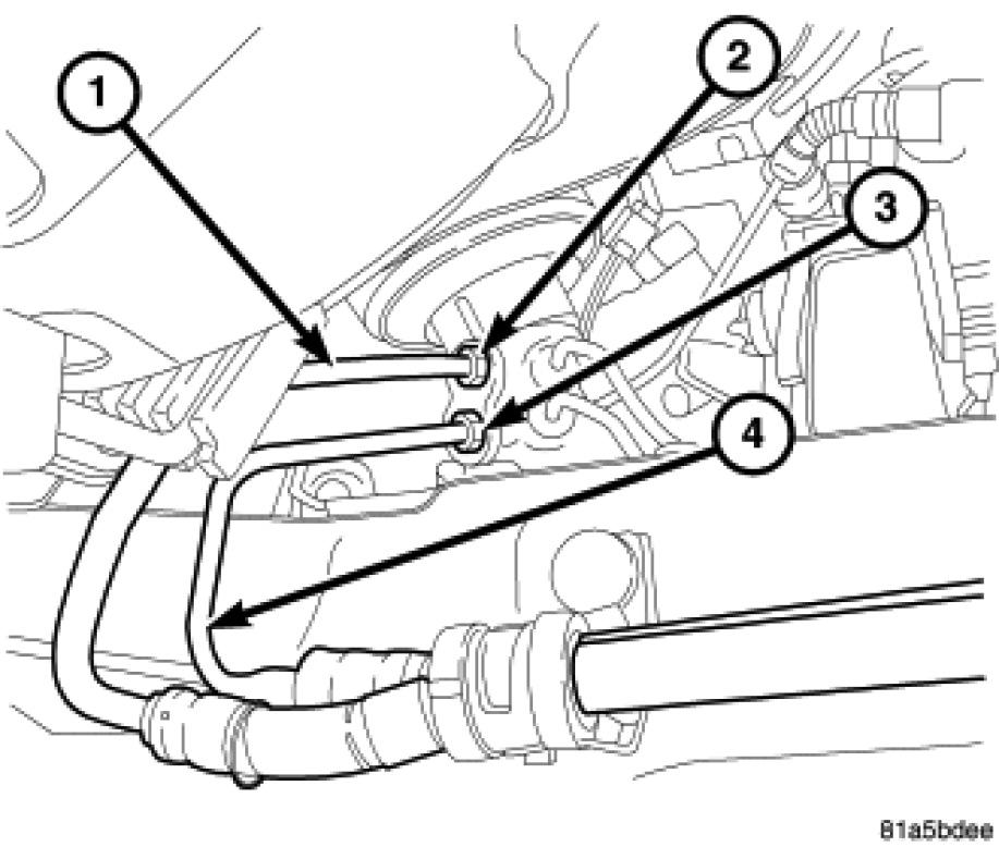 1. Install the pressure hose tube (4) at the gear. Tighten the tube nut (3) to 32 Nm (24 ft. lbs.).
