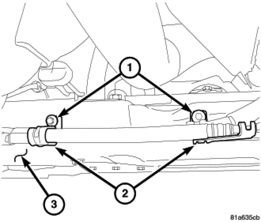 3. Position the power steering hose (2) routing clamp at the right side of the crossmember (3). Install and tighten the routing clamp screw to 8 Nm (71 in. lbs.).
