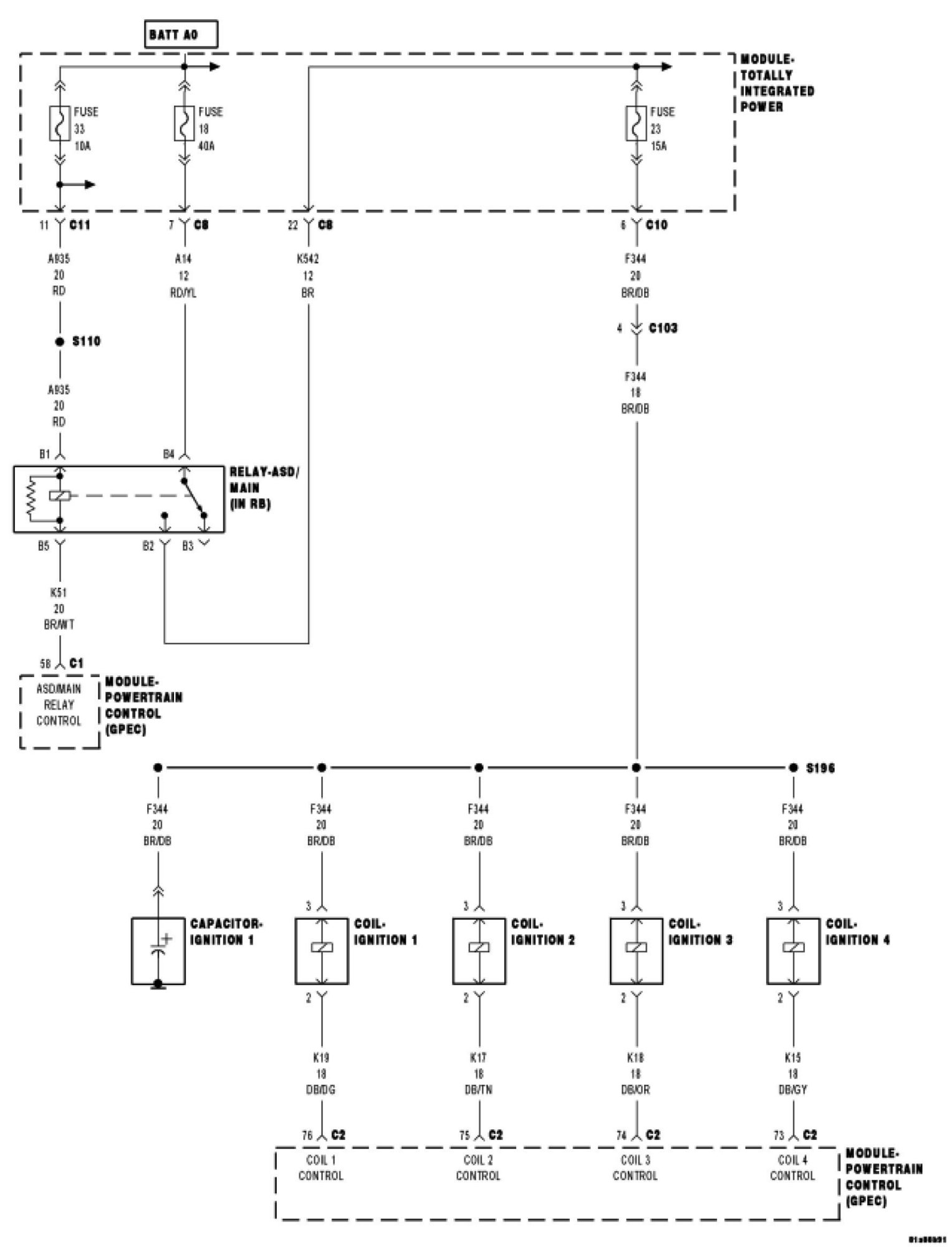 Using a 12 volt test light connected to ground, check the Main/ASD Relay output circuit in the ignition coil harness connector.