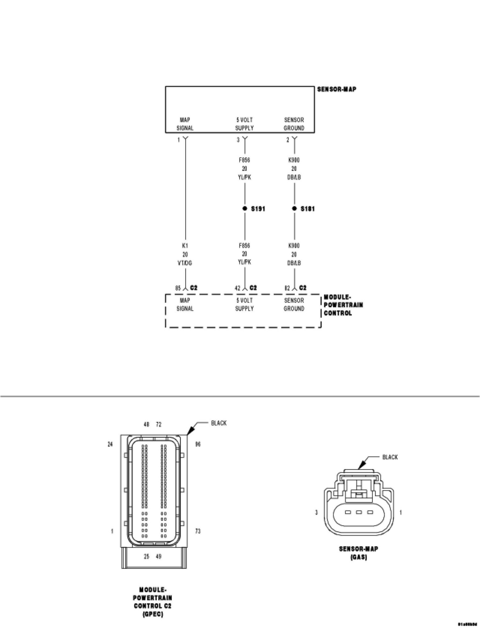 Using the wiring diagram/schematic as a guide, inspect the wiring and connectors between the MAP Sensor and the Powertrain Control Module (PCM).