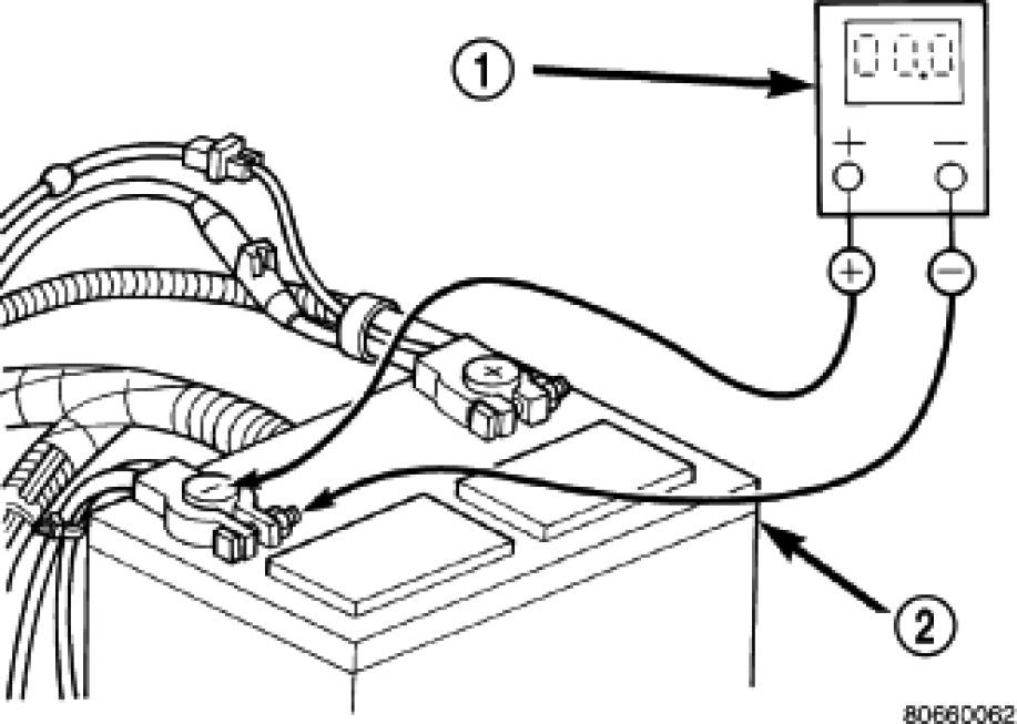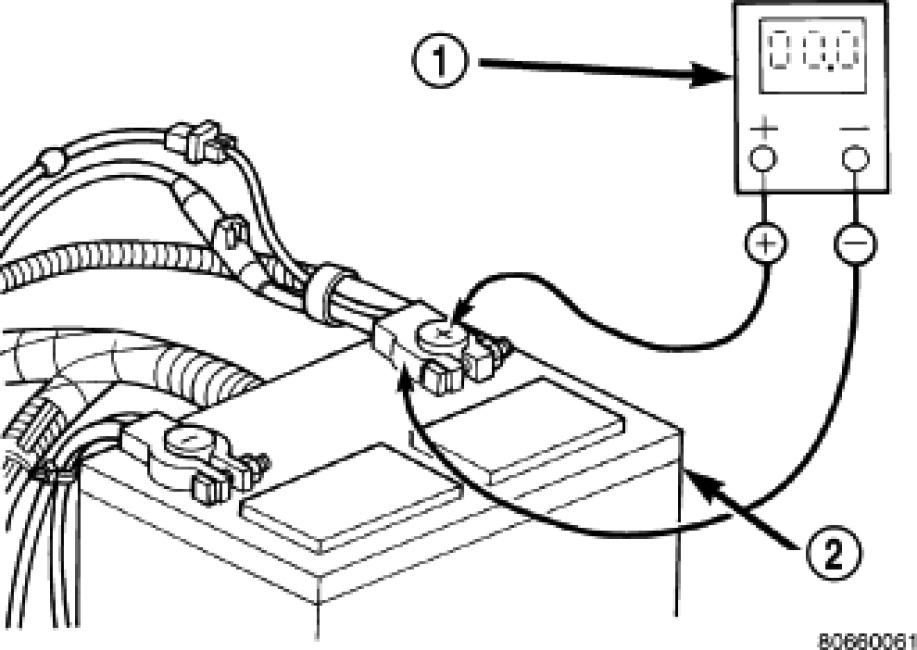 2. Connect the positive lead of the voltmeter (1) to the battery (2) positive terminal post. Connect the negative lead of the voltmeter (1) to the battery (2) positive cable terminal clamp. Rotate and hold the ignition switch in the Start position. Observe the voltmeter. If voltage is detected, correct the poor connection between the battery positive cable terminal clamp and the battery positive terminal post.