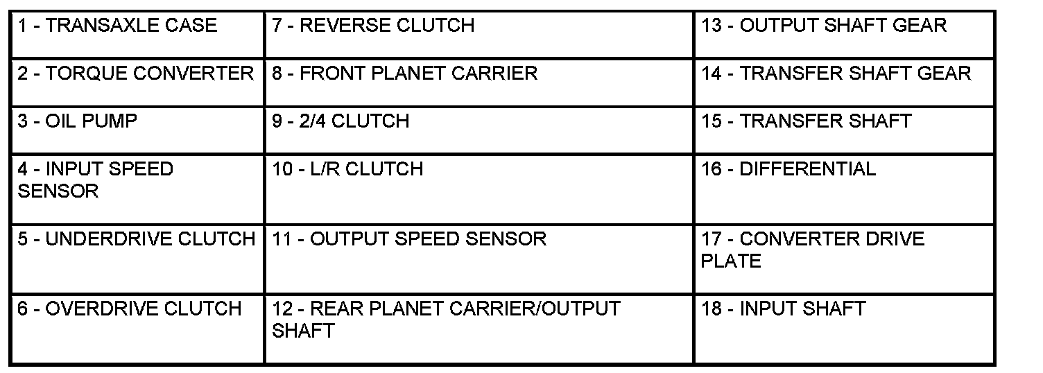 The 40TE is a four-speed transaxle that is a conventional hydraulic/mechanical assembly with an integral differential, and is controlled with adaptive electronic controls and monitors. The hydraulic system of the transaxle consists of the transaxle fluid, fluid passages, hydraulic valves, and various line pressure control components. An input clutch assembly which houses the underdrive, overdrive, and reverse clutches is used. It also utilizes separate holding clutches: 2nd/4th gear and Low/Reverse. The primary mechanical components of the transaxle consist of the following: