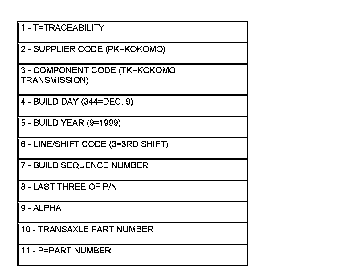 The label contains a series of digits that can be translated into useful information such as transaxle part number, date of manufacture, manufacturing origin, plant shift number, build sequence number, etc. Refer to for identification label breakdown.