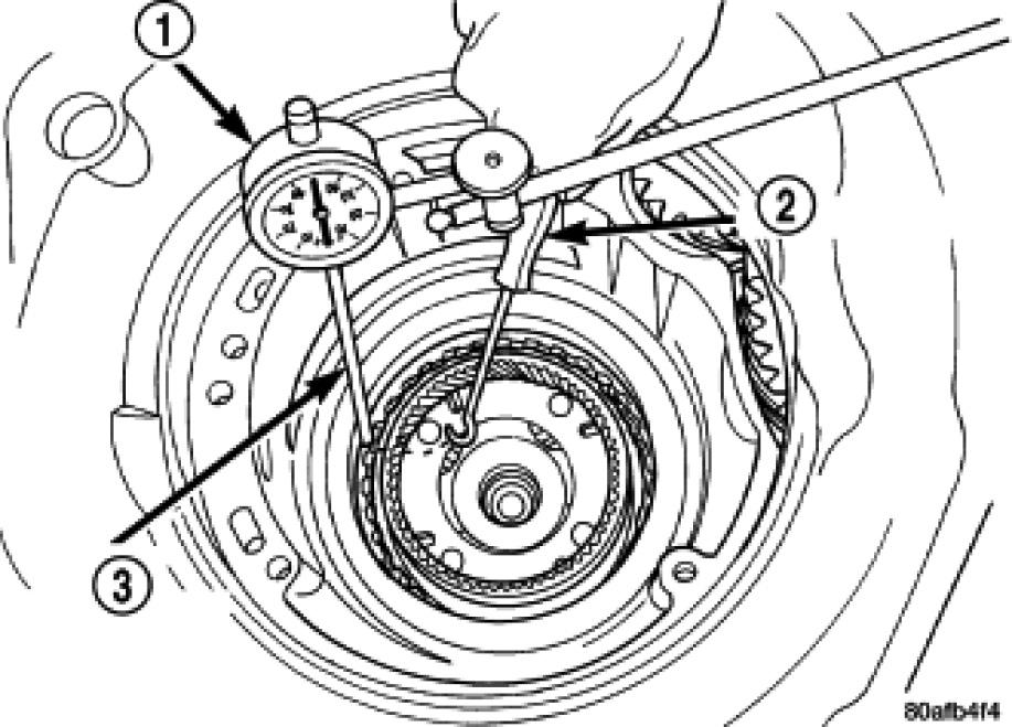 54. Set up Dial Indicator (1), Indicator tip 6268 (3) and Hook tool (2), measure 2/4 clutch clearance. Press down on clutch pack with finger and zero dial indicator. 2/4 clutch pack clearance is 0.76-2.64 mm (0.030-0.104 in.). Set up indicator and record measurement in four places. Take average of readings. If clearance is outside this range, the clutch is assembled improperly. There is no adjustment for 2/4 clutch clearance.