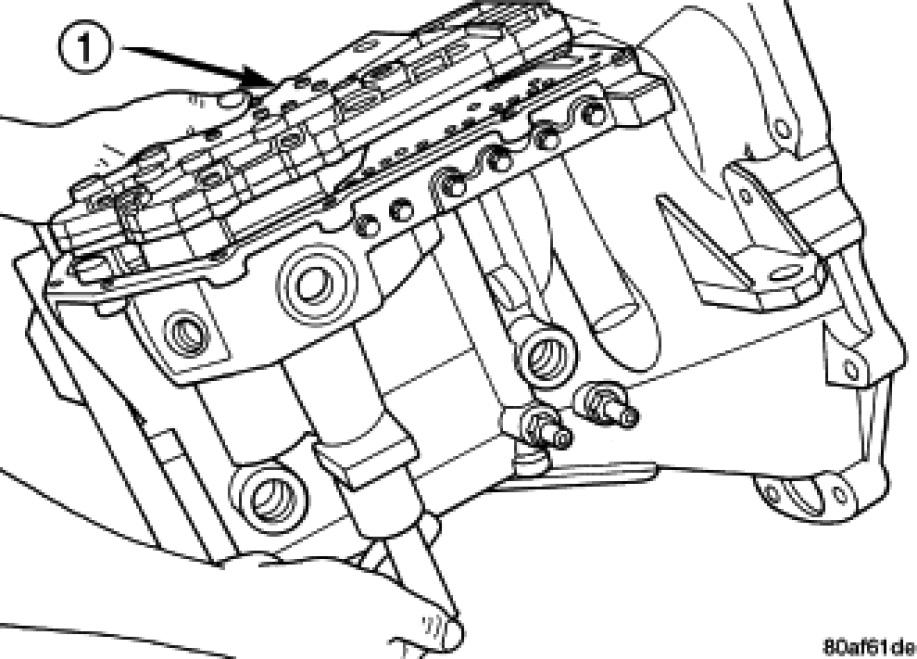 75. Install valve body (1) to transaxle. Rotate manual valve shaft fully clockwise to ease installation. Make sure park rod rollers are positioned within park guide bracket.