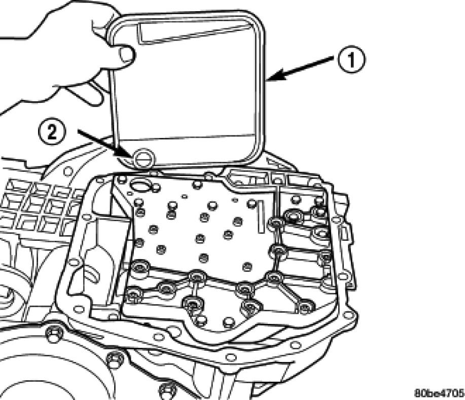 78. Apply a 1/8" bead of Mopar(R) ATF RTV (MS-GF41) (2) to oil pan (1) and immediately install to case.