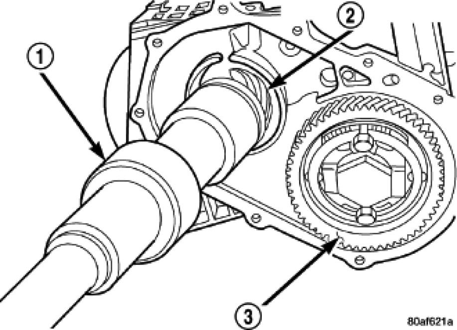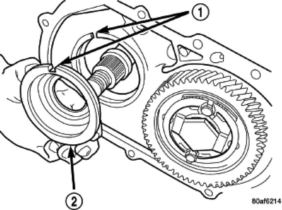 48. Using Snap Ring Pliers 6051(1), remove transfer shaft bearing snap ring (2).