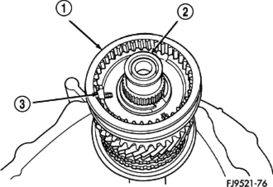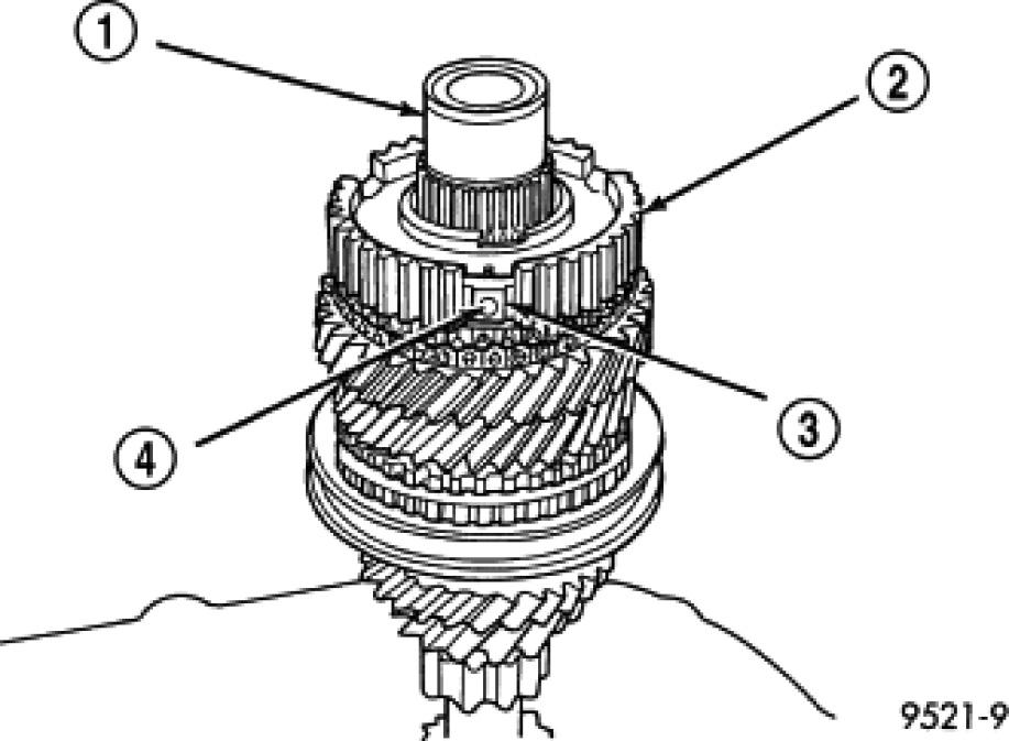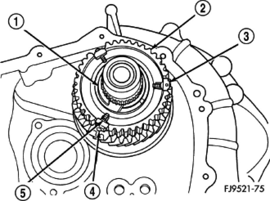1. Position synchronizer hub (5) onto a suitable holding fixture (input shaft). The synchronizer hubs (5) are directional. The hubs must be installed with the U facing upward.