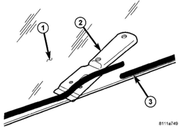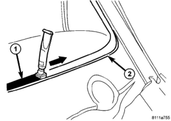 4. Install a new rubber seal (2) along the top of the windshield (1).