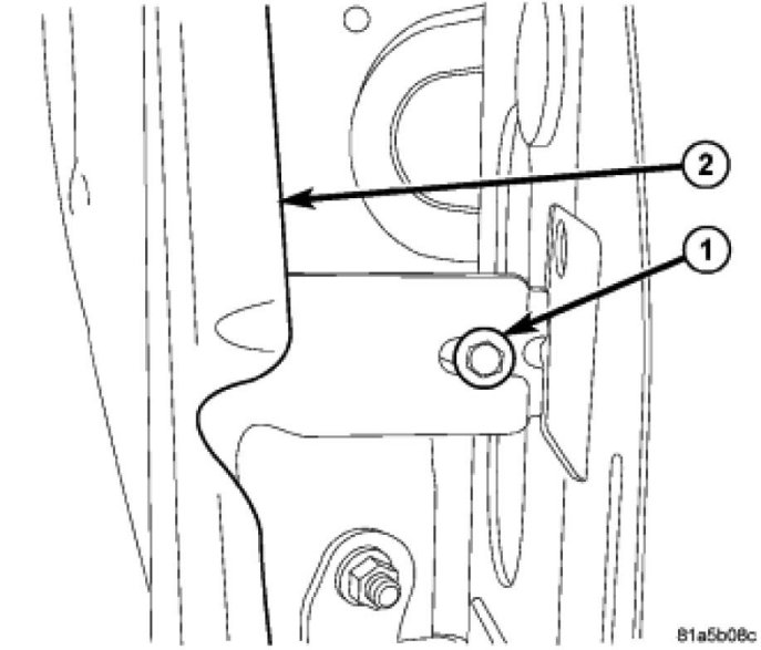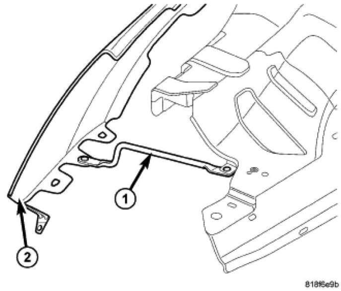 2. From inside engine compartment, start the center upper rail bolt. Install all the fasteners (1) attaching fender to upper rail and tighten.