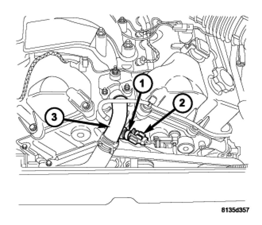 2. Install engine coolant temperature sensor (1) into coolant outlet tube (3).