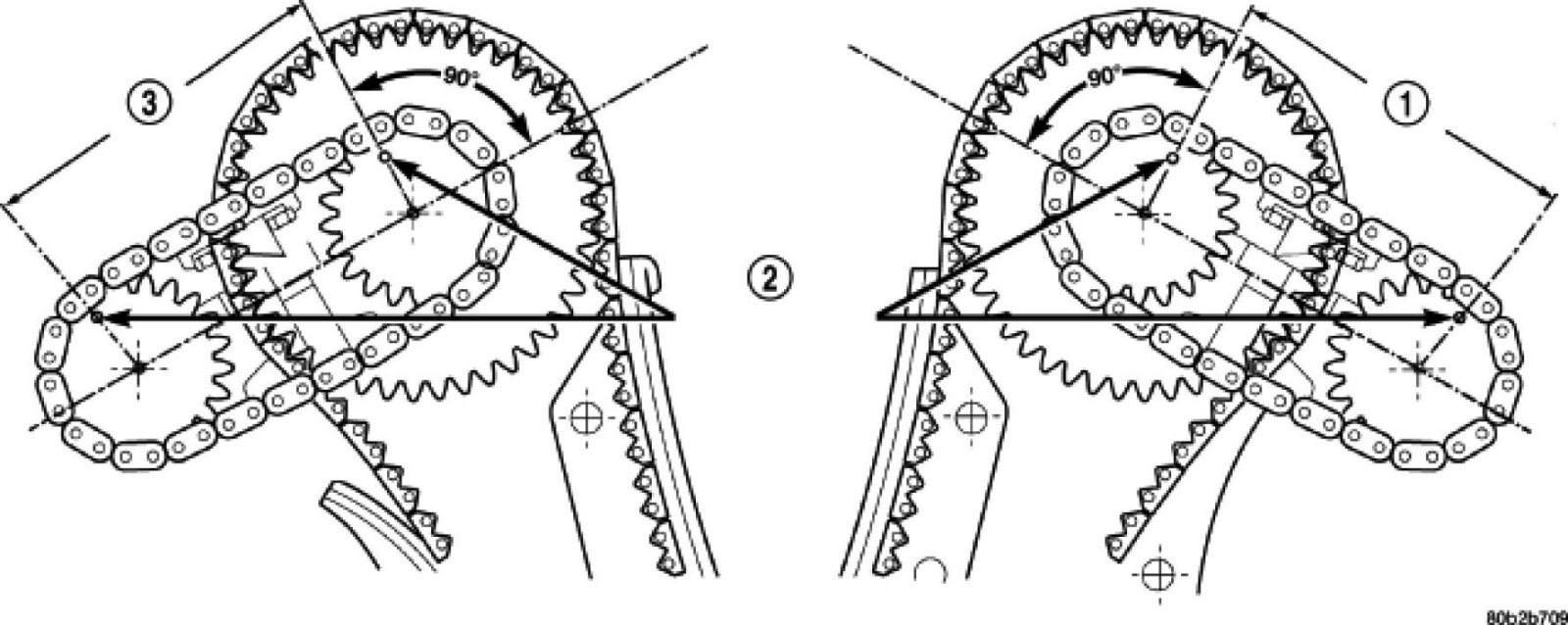3. View the intake camshaft sprocket timing mark. The mark should be 90� from the cylinder head cover sealing surface (1) on both right and left cylinder banks.