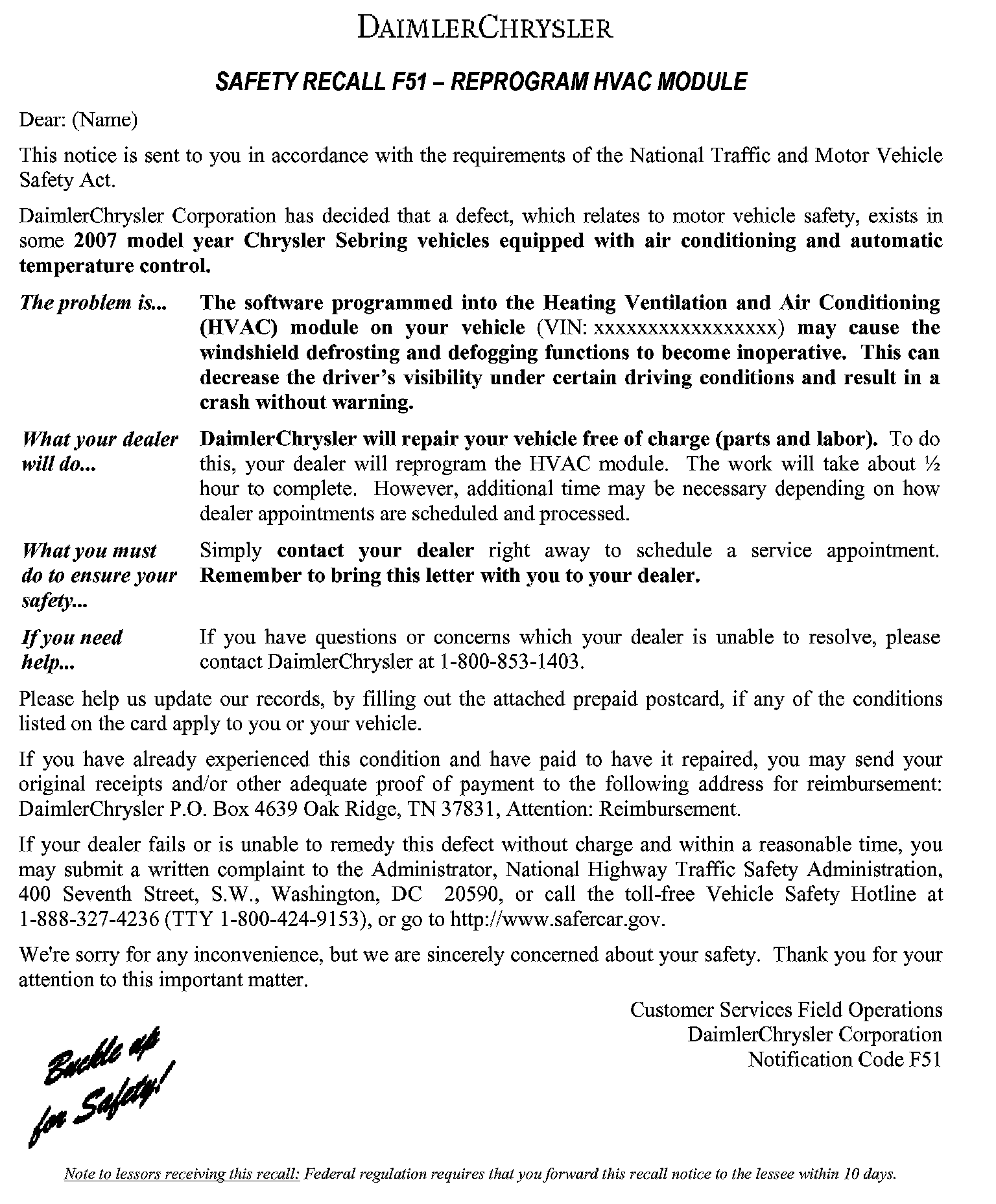 Recall - Reprogram HVAC Module