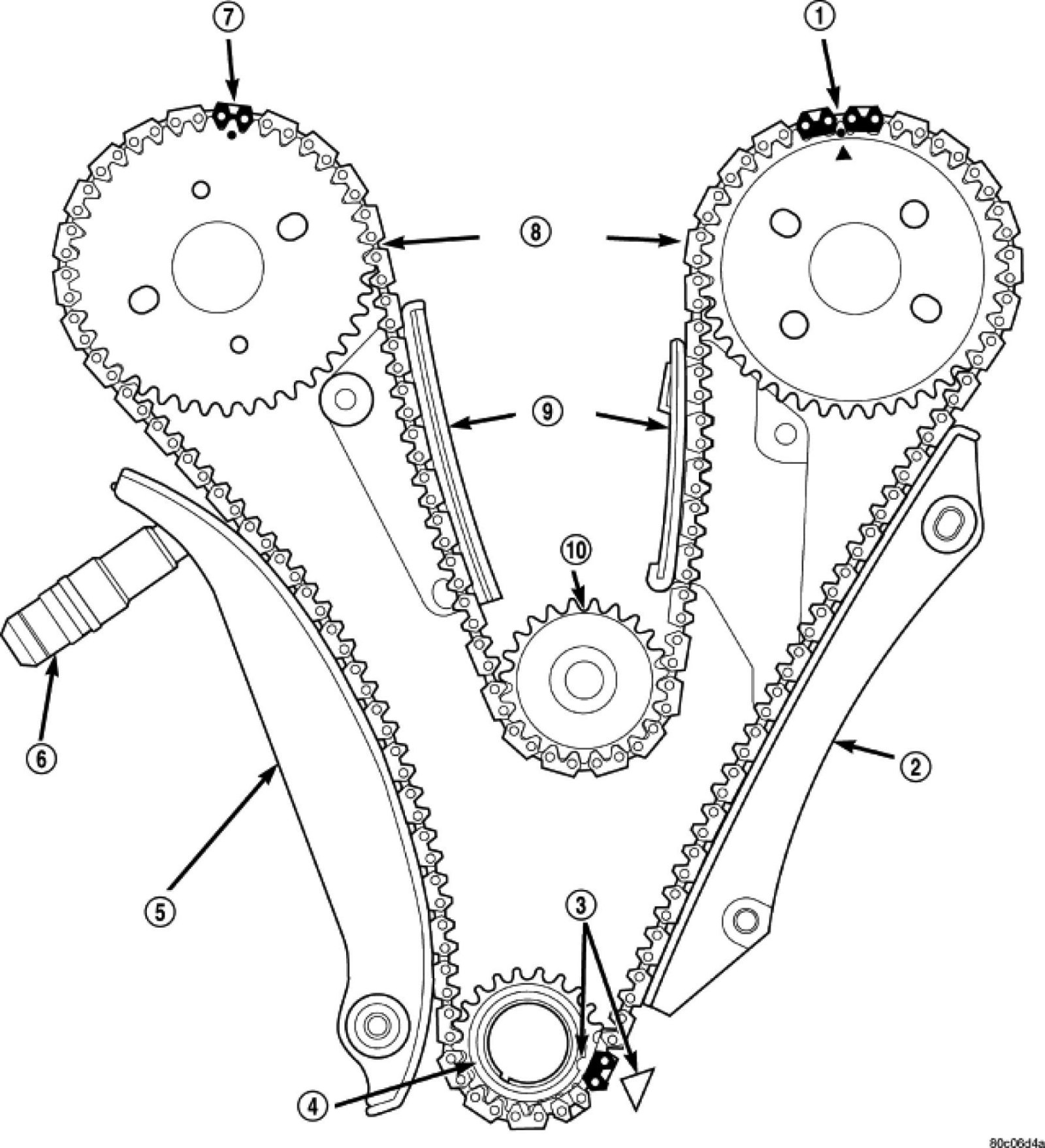 ^ Verify that all chain timing (plated) links are properly aligned to the timing marks on all sprockets.