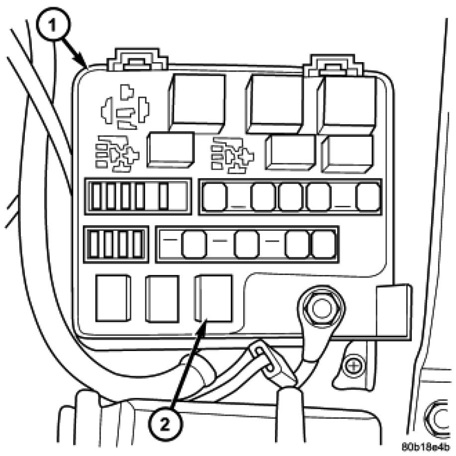 The transmission control relay (2) is located in the Power Distribution Center (PDC) (1), which is located on the left side of the engine compartment.