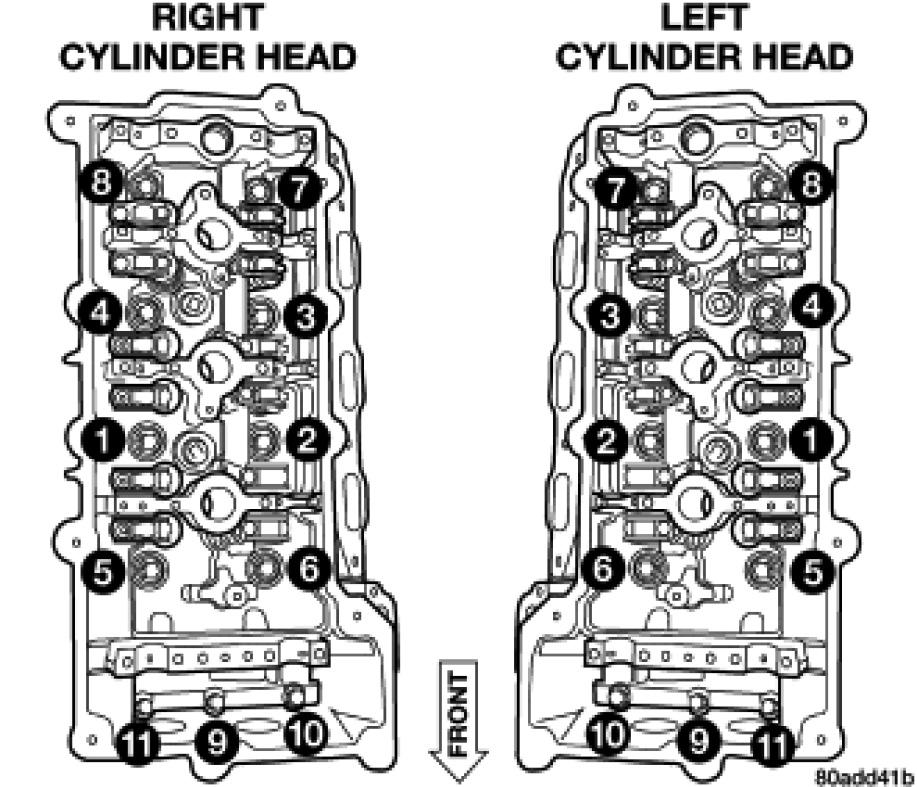 NOTE: The cylinder head bolts (4) are tightened using a torque plus angle procedure. The bolts must be examined BEFORE reuse. If the threads are necked down the bolts must be replaced