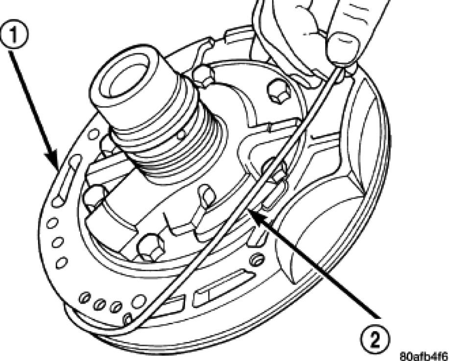 58. Remove oil pump O-ring (2). Be sure to reinstall oil pump O-ring after selecting the proper #4 thrust plate.