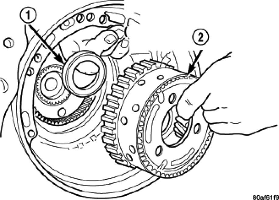 NOTE: The number seven needle (1) bearing has three anti-reversal tabs and is common with the number five and number two position. The orientation should allow the bearing to seat flat against the rear sun gear. A small amount of petrolatum can be used to hold the bearing to the rear sun gear (2).