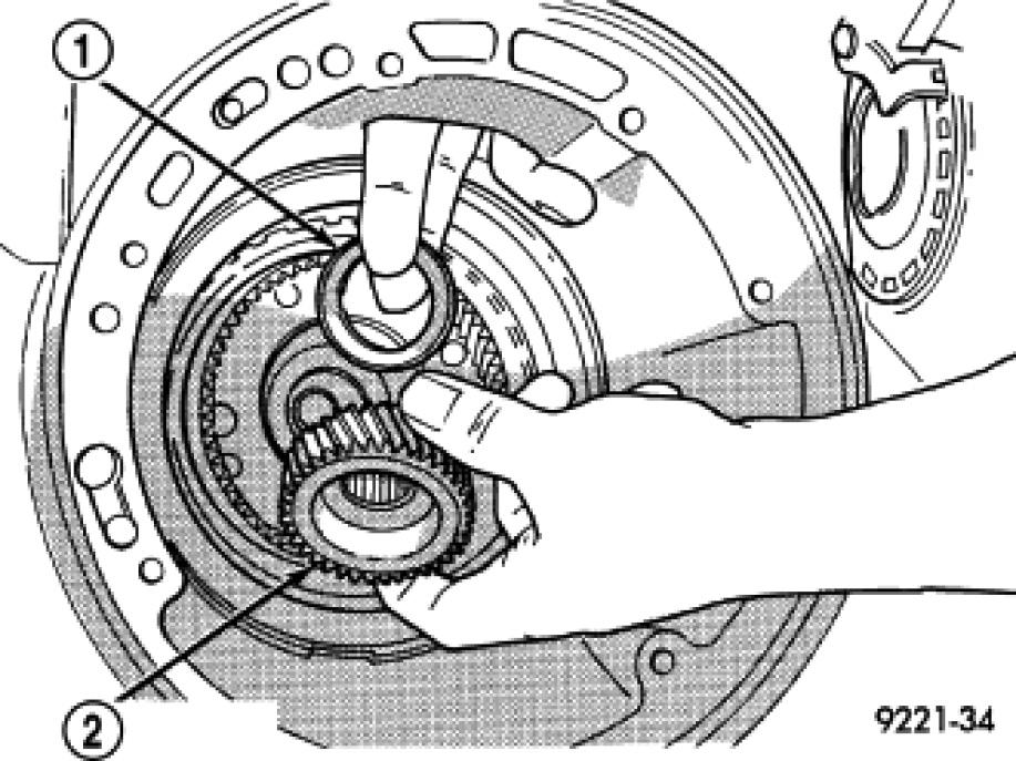 53. Install rear sun gear (2) and #7 needle bearing (1).
