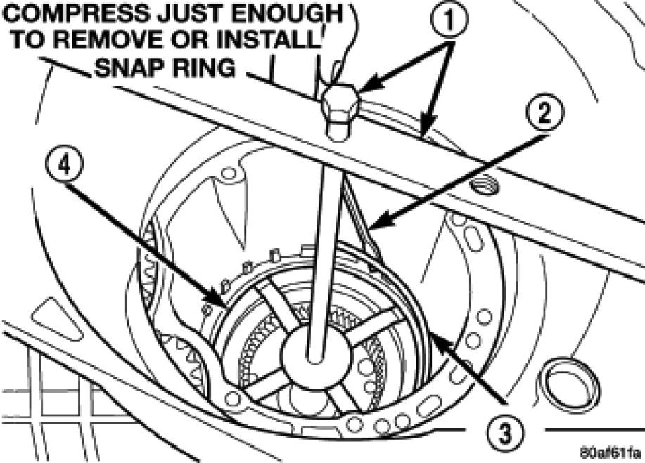 50. Using Compressing Tool 5058-A (1), compress 2/4 clutch return spring just enough to install snap ring (3).