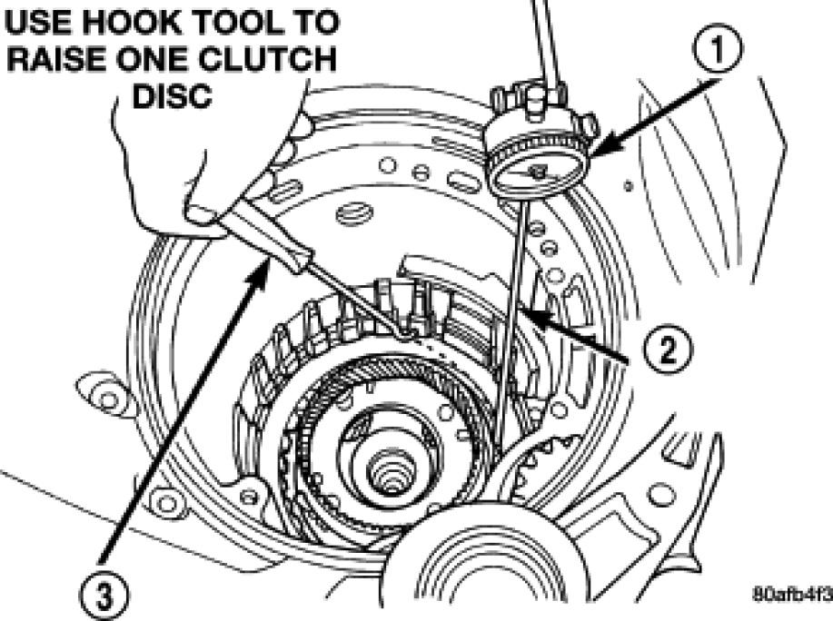 52. Set up dial indicator (1) and measure 2/4 clutch clearance. Press down on clutch pack with finger and zero dial indicator. 2/4 clutch pack clearance is 0.76-2.64 mm (0.030-0.104 in.). Set up indicator and record measurement in four (4) places. Take average of readings. If clearance is outside this range, the clutch is assembled improperly. There is no adjustment for 2/4 clutch clearance.