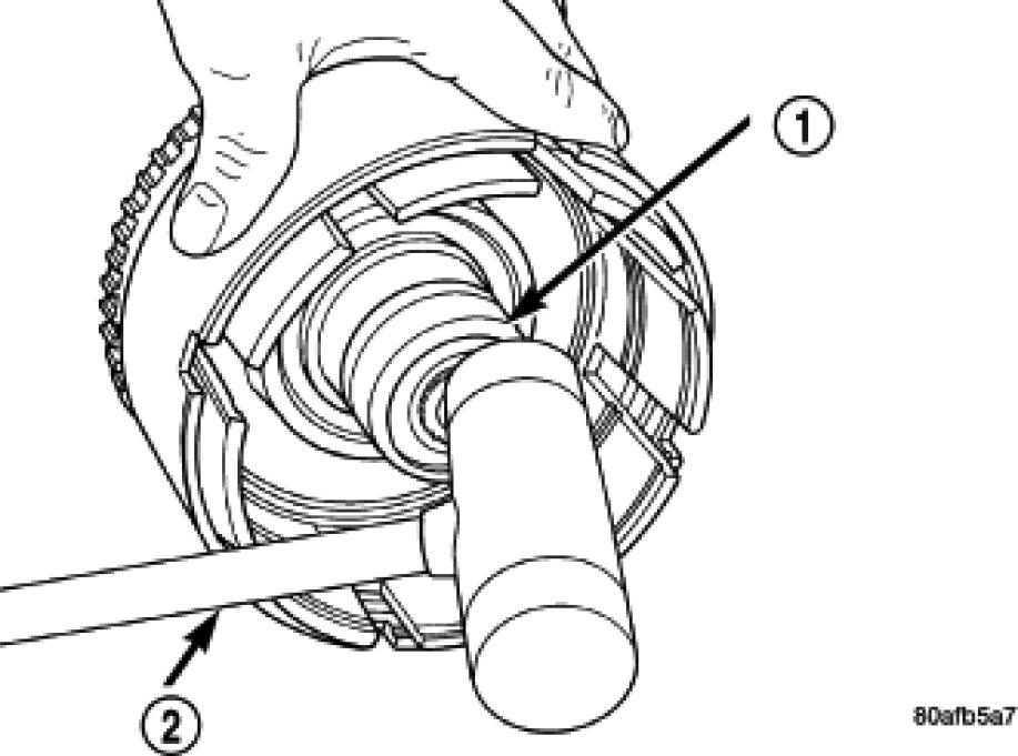 2. Tap down reverse clutch reaction plate (4) to release pressure from snap ring (2).