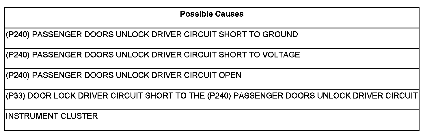 - Repair the (P33) Door Lock Driver for a short to the (P240) Passenger Doors Unlock Driver circuit.
