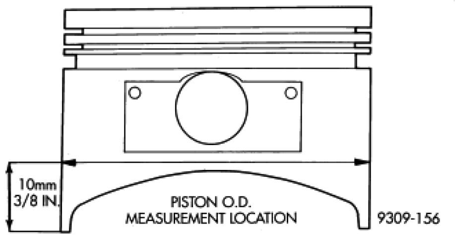 Piston and cylinder wall must be clean and dry. Piston diameter should be measured 90 degrees to piston pin at size location. Cylinder bores should be measured halfway down the cylinder bore and transverse to the engine crankshaft center line Refer to ENGINE SPECIFICATIONS. Pistons and cylinder bores should be measured at normal room temperature, 70� F (21� C).