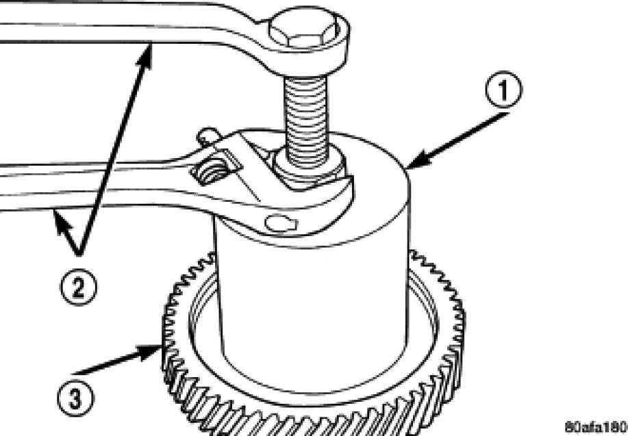 52. Using Gear Puller L-4407 (1) and Button 6055 (3) remove output shaft transfer gear (2) and select shim.