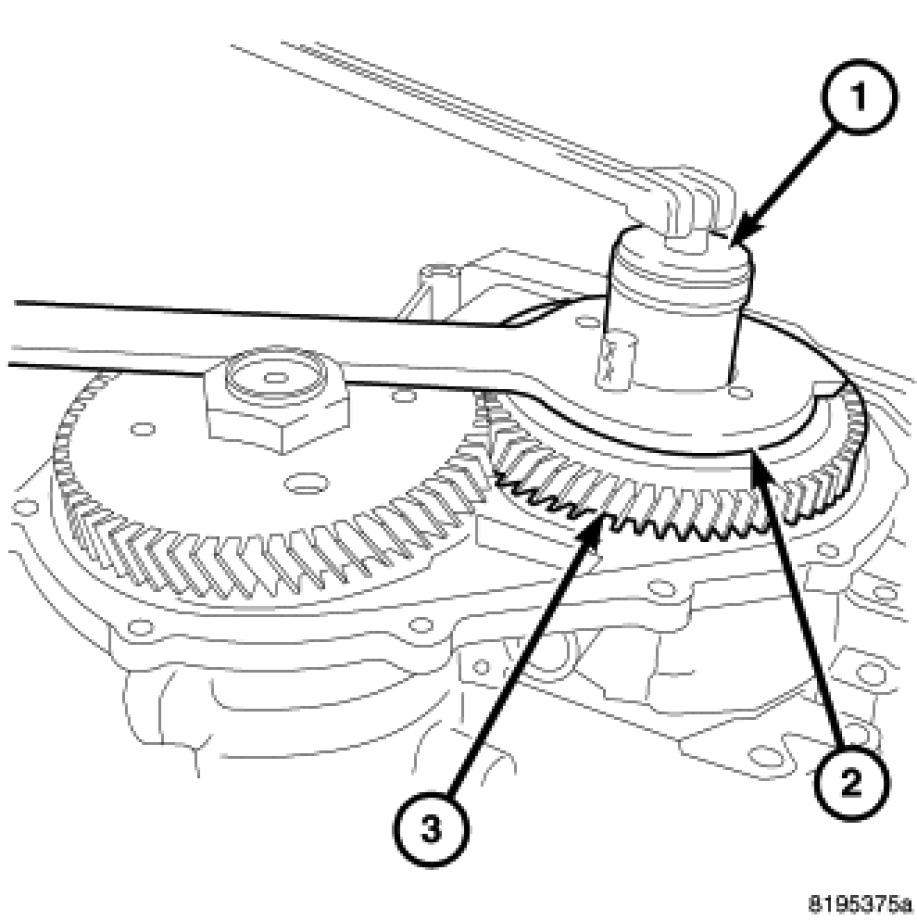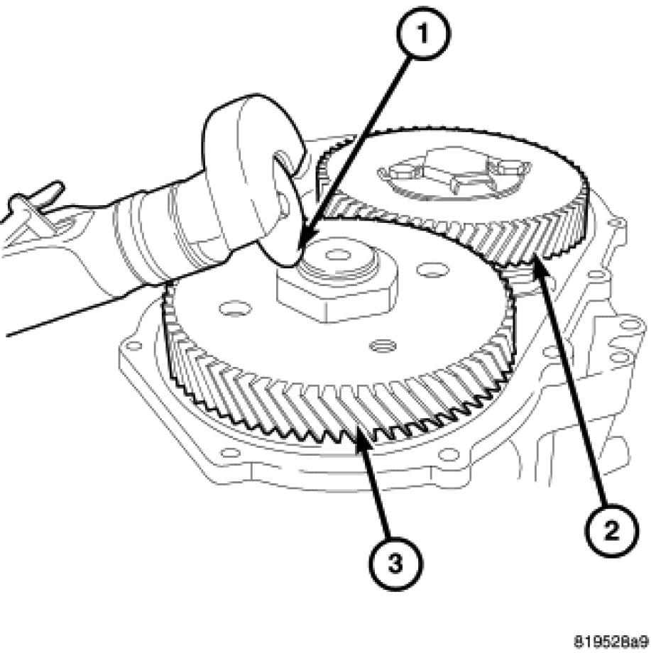 47. Install Holder 9739 (2) onto the output transfer gear (3).