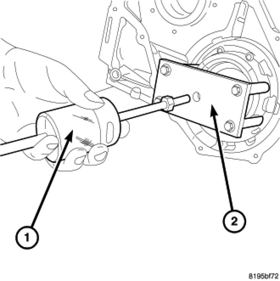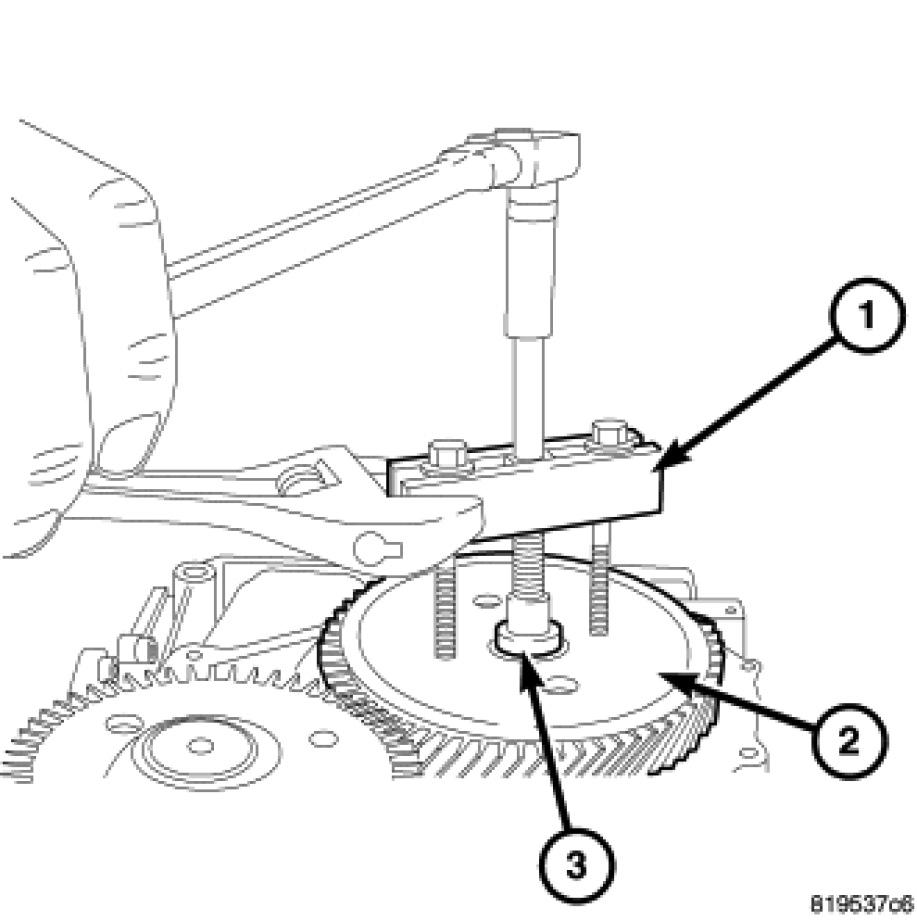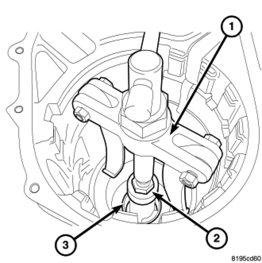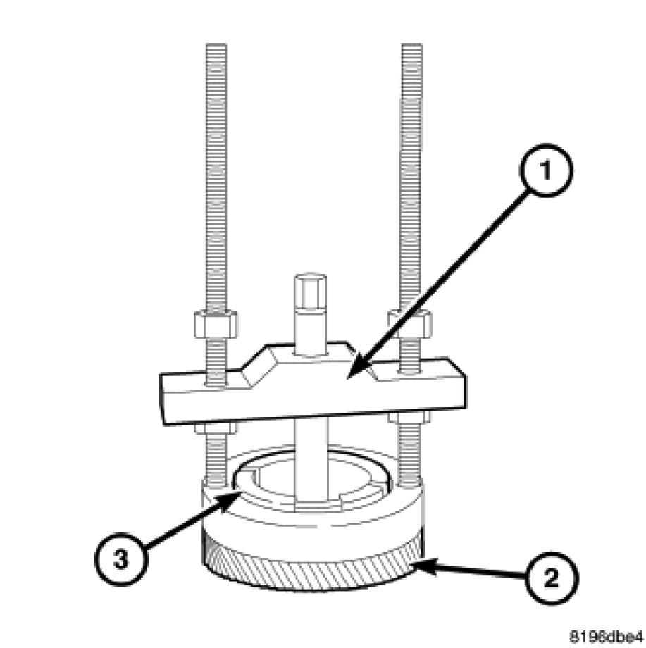 75. Using Remover 8913 (2) and Brace 8915 (1) remove the remote pinion cover bearing cup (3) and selective shim.