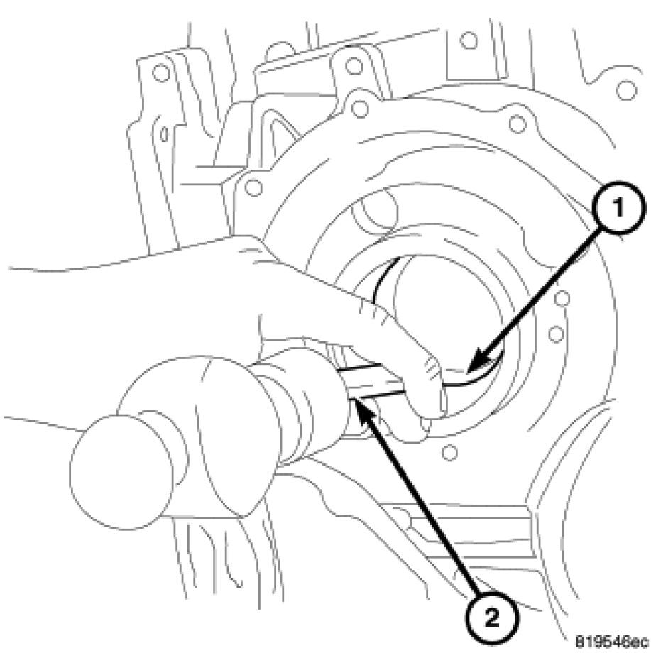 65. Using a hammer and suitable drift (2), drive out inner output bearing cup (1).