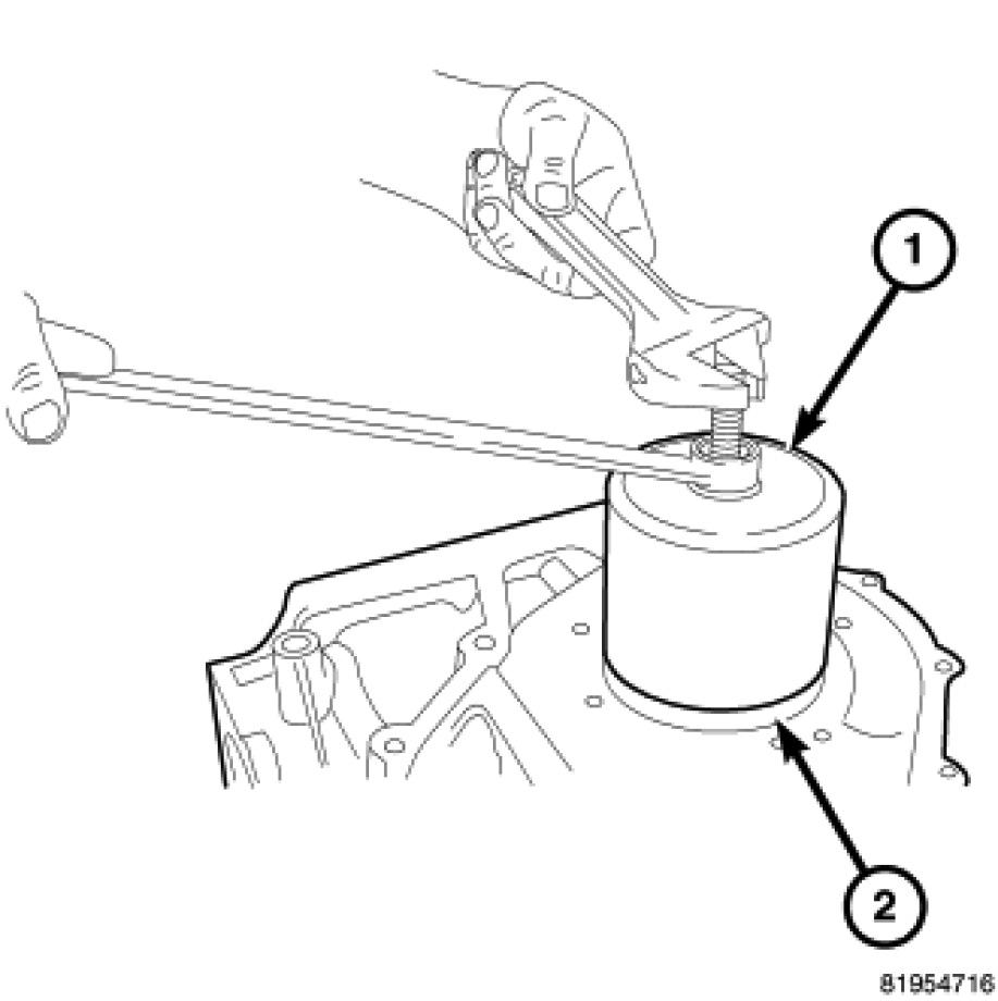 60. Remove low/reverse spring compressor tool and low reverse piston return spring (1).