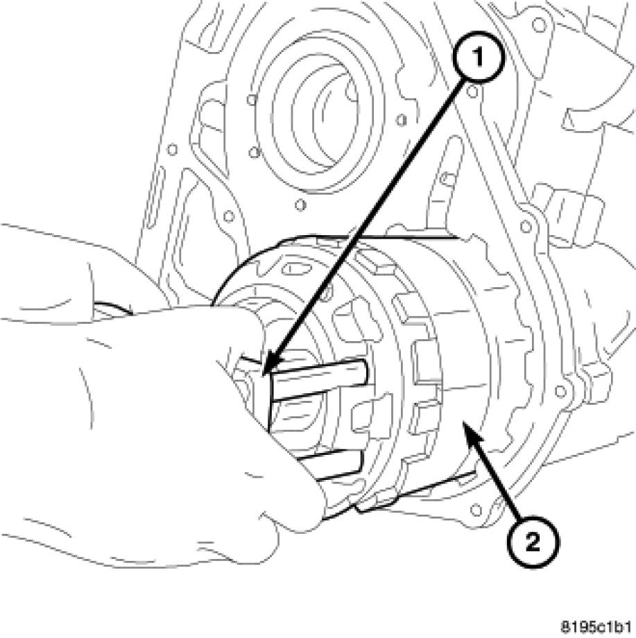 64. Remove low/reverse piston retainer-to-case gasket (2), gasket holes must line up (1).