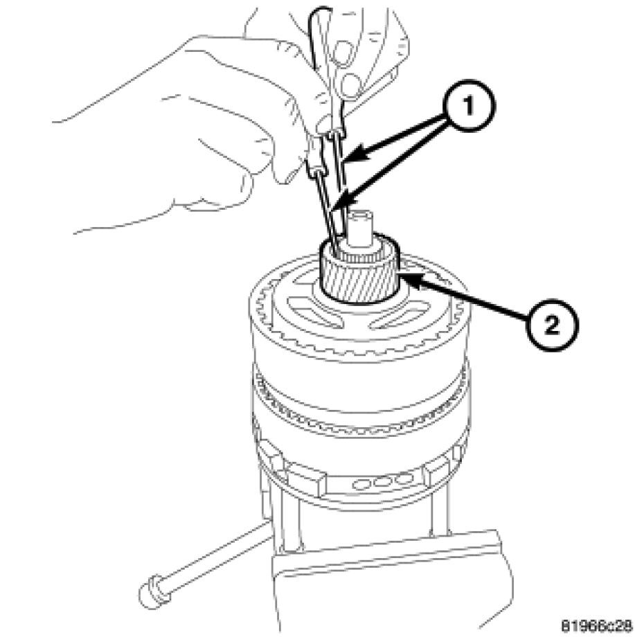 28. Remove the Bearing Retainer Assembly Remover (1) from the low clutch (2).