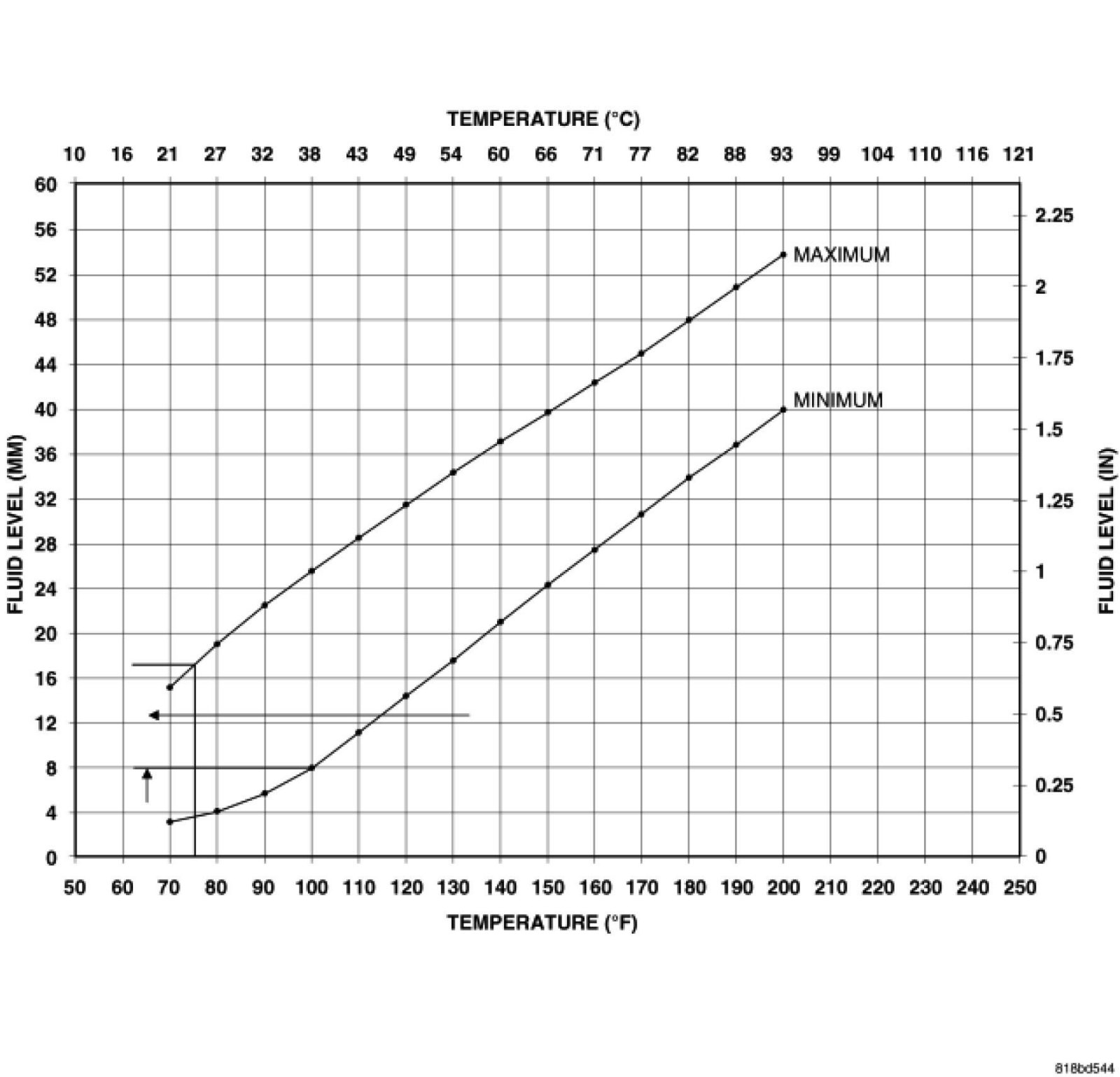 7. The transmission Oil Dipstick 9336 has indicator marks every 10 mm. Determine the height of the oil level on the dipstick and using the height, the transmission temperature, and the Transmission Fluid Graph, determine if the transmission oil level is correct.