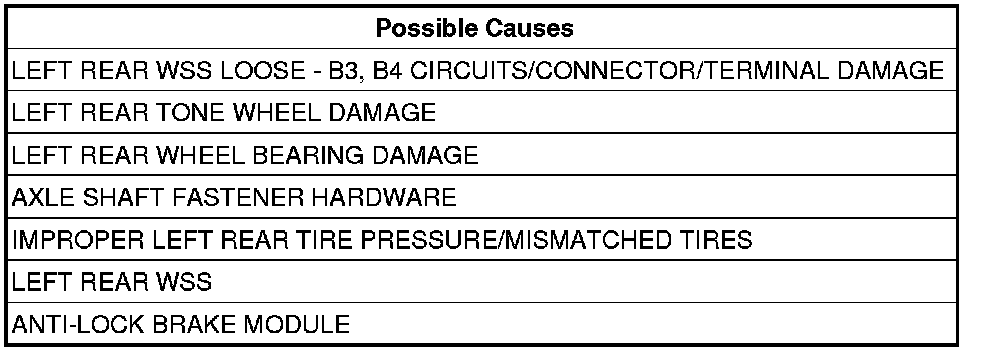 Inspect the (B3) Left Rear WSS Signal and (B4) Left Rear WSS Supply circuits between the Left Rear WSS and Anti-Lock Brake Module for damage.