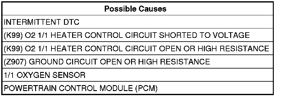 - Repair the (K99) O2 1/1 Heater Control circuit for an open circuit or high resistance.