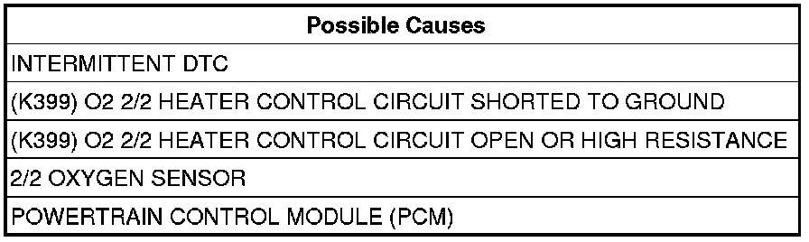 - Repair the (K399) O2 2/2 Heater Control circuit for a short to ground.