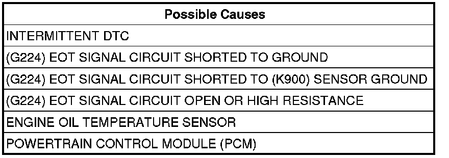 Measure the resistance between the (G224) EOT Signal circuit and the (K900) Sensor Ground circuit in the Engine Oil Temperature Sensor harness connector.