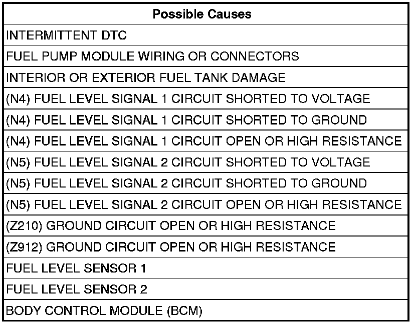 - Repair the (N5) Fuel Level Signal 2 circuit for an open circuit or high resistance.