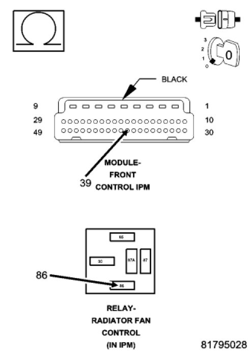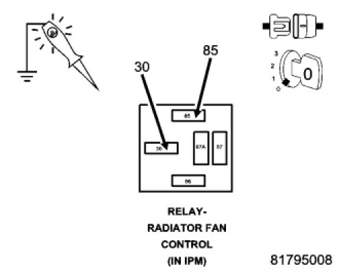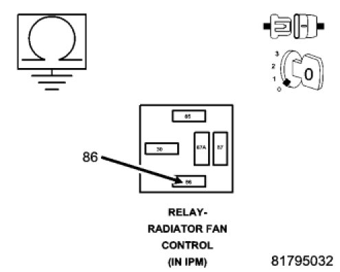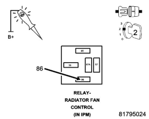 Using a 12-volt test light connected to battery voltage, check the Radiator Control Relay Control circuit.