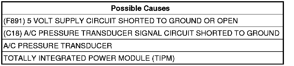 The TIPM detects that the A/C Pressure Transducer input voltage is below 0.3 volts for 2-3 seconds.