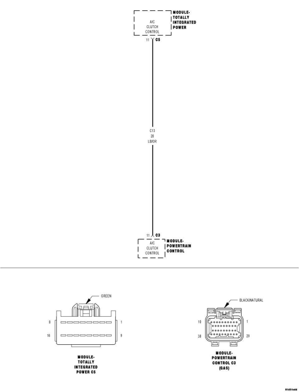 Using a 12 volt test light connected to 12 volts, check the (C13) A/C Clutch Control circuit in the C5 TIPM harness connector.